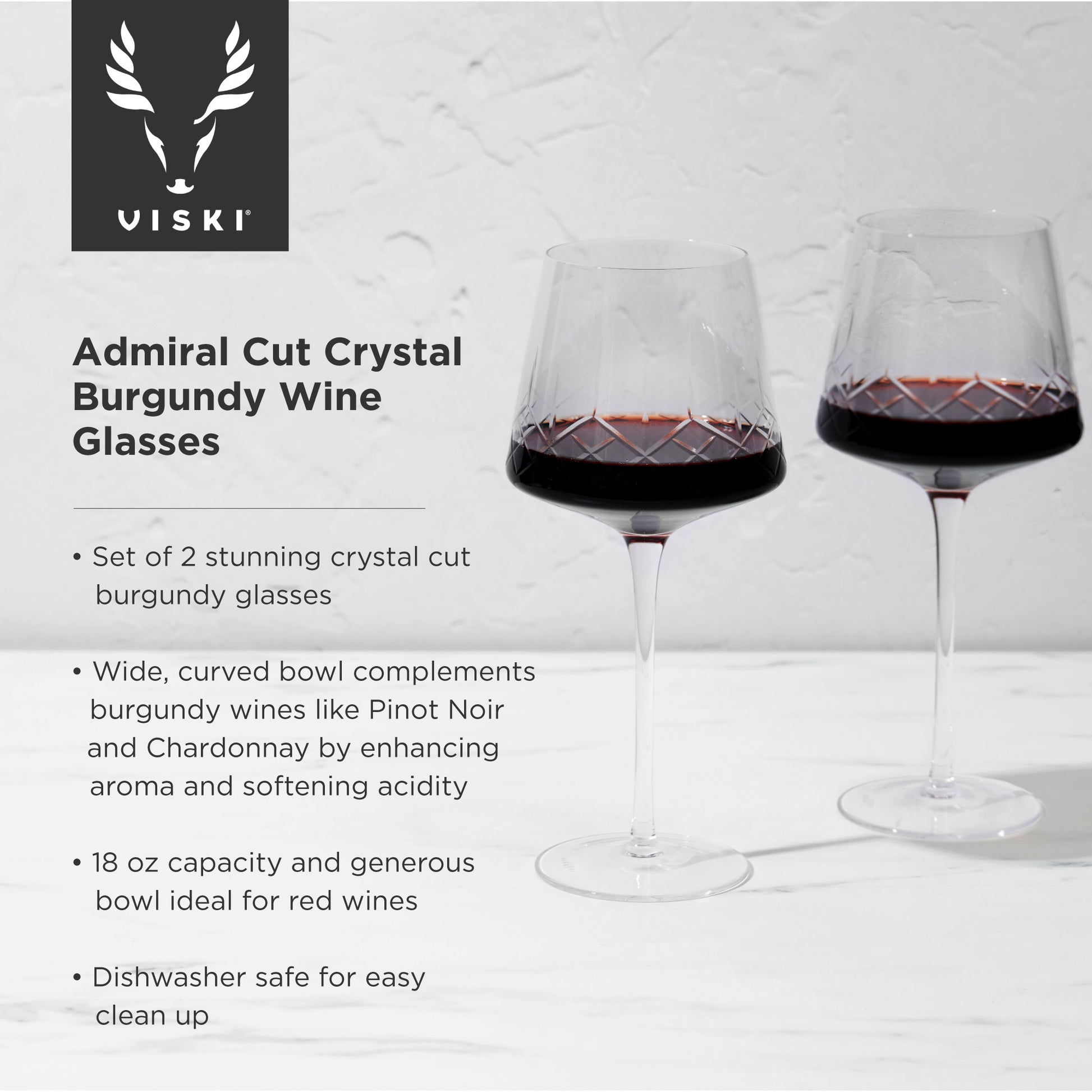 An elegant extension of the bestselling Admiral Collection, these cut crystal Burgundy wine glasses by Viski® are crafted to elevate the depth, aroma, and character of your favorite red wines. The hand-etched linework brings timeless detailing, while the modern silhouette and generous 18 oz bowl allow each pour to breathe beautifully.