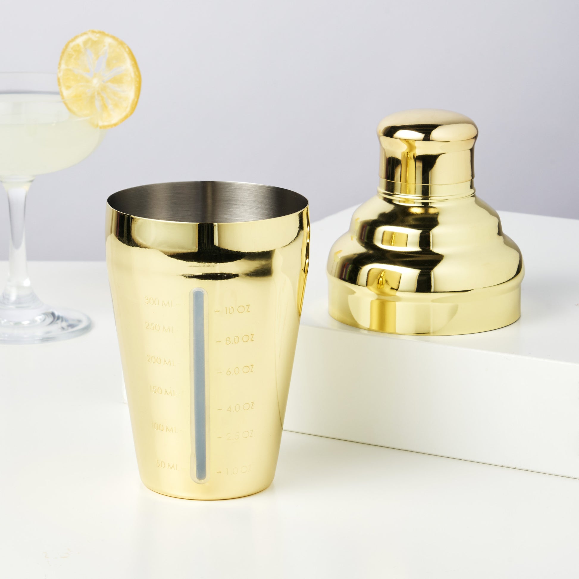 Elevate your mixology game with the Viski® Belmont Measured Cocktail Shaker in gold—the perfect blend of function and sophistication. Designed for precision pouring, this 14 oz gold-plated stainless steel shaker features both U.S. standard and metric measurements, along with a clear viewing window, ensuring perfect ratios for every cocktail. Whether you're a home bartender or a seasoned mixologist, this statement piece brings effortless style and accuracy to your bar cart.