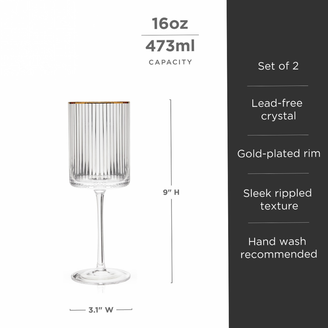 Indulge in timeless sophistication with this set of ribbed crystal wine glasses, designed to elevate every pour. Crafted from premium lead-free crystal, each glass features a fluted design and gold-dipped rim inspired by Art Deco architecture—bringing a touch of vintage luxury to modern entertaining.