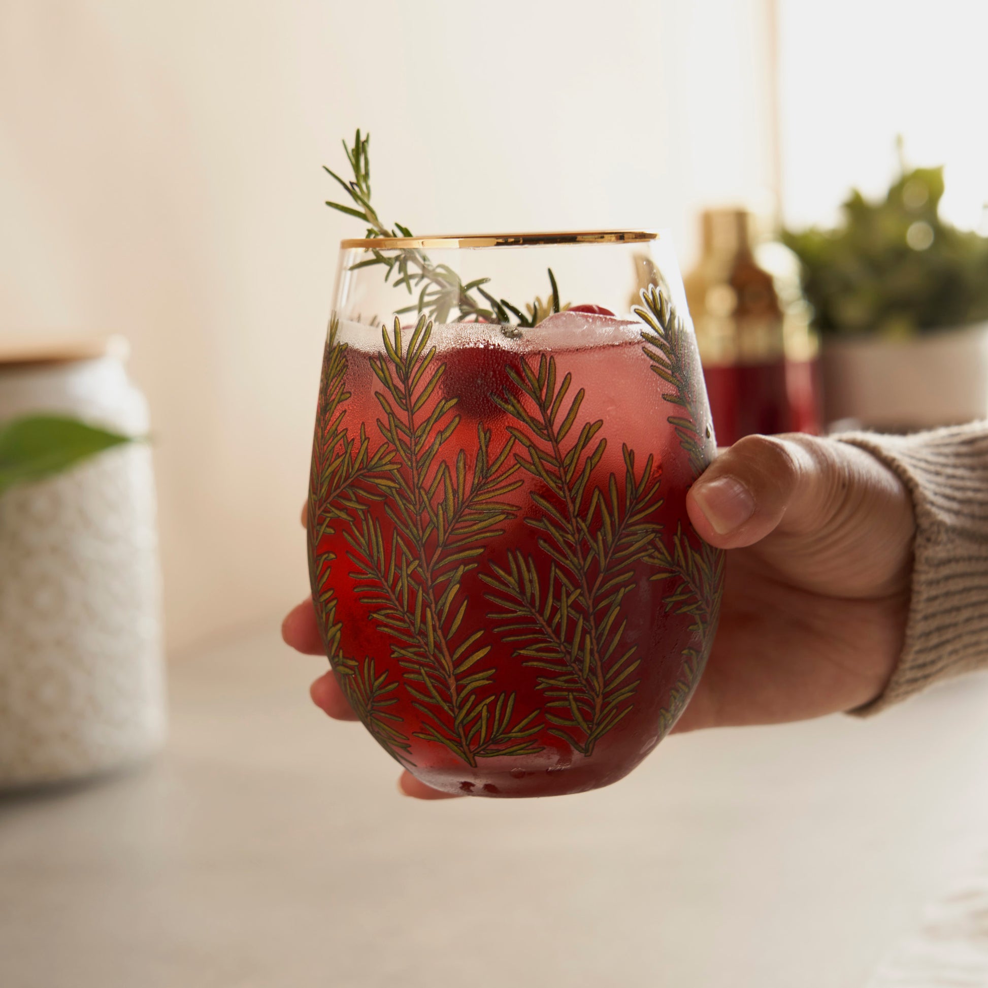 The Woodland Stemless Wine Glass Set from Twine® features delicate evergreen sprigs and a shimmering electroplated gold rim, blending rustic beauty with timeless elegance. Perfect for winter gatherings or year-round entertaining, these glasses make every sip feel special.